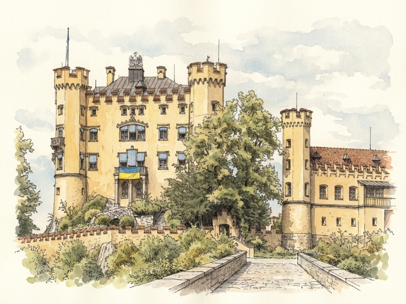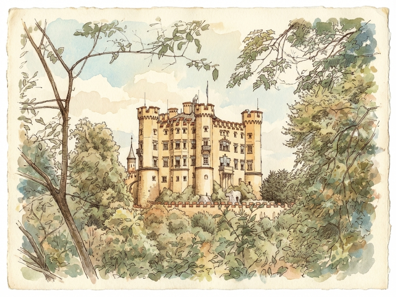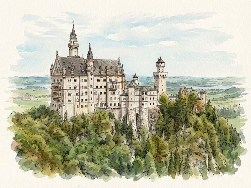 Ludwig II’s dream of a medieval knight’s castle took physical form in the Bavarian Alps as a stunning display of Romanesque Revival architecture. Clad in pale limestone, its slender round towers and crenelated walls rise sharply against the dark green of the Ammergau Alps, creating a silhouette that feels more like a stage set than a fortress. Inside, the design shifts into an opulent, almost dizzying tribute to the operas of Richard Wagner, with the Throne Hall and Singers' Hall covered in intricate frescoes of Germanic legends. While it was built with the aesthetic of the Middle Ages, the castle was a marvel of 19th-century technology, featuring integrated central heating, running water on every floor, and an electric bell system for summoning servants.