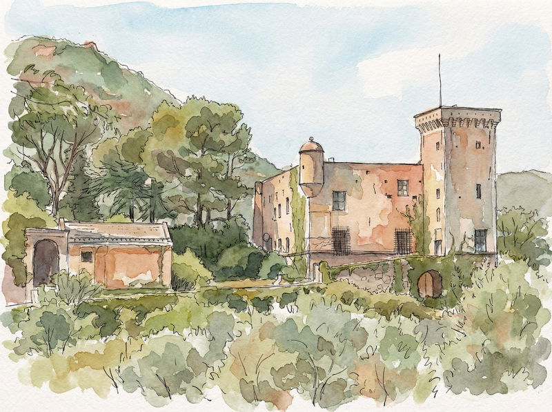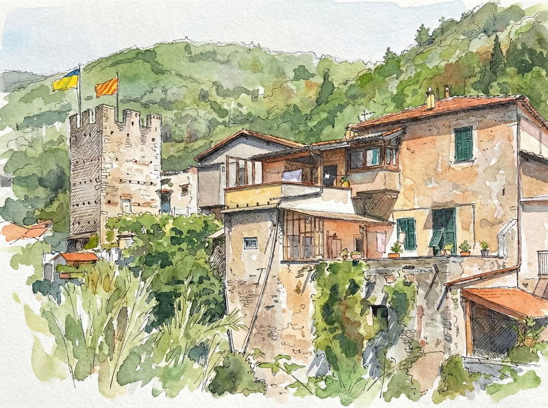 The crumbling limestone skeleton of Conscente Castle looms over the Pennavaira Valley, its jagged profile cutting a sharp silhouette against the Ligurian sky. Far from a manicured monument, the fortress wears its history in the form of weathered stone and encroaching greenery, reflecting the centuries it spent as a defensive sentinel for the Costa-Del Carretto family. Narrow slit windows and thick, unyielding walls evoke a sense of medieval austerity, while the surrounding olive groves and quiet village rooftops provide a soft, pastoral contrast to its rugged, battle-worn character.
