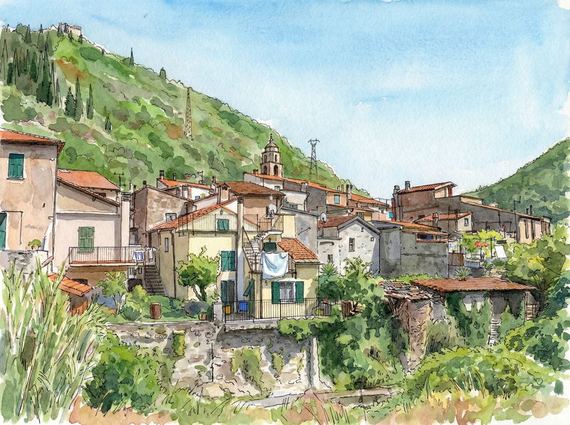 The Italian village of Zuccarello emerges from the lush greenery of the Neva Valley as a remarkably preserved relic of the late 13th century. Characterized by its single, long main street lined with heavy stone porticoes, the town’s architecture was designed for both commerce and defense, allowing medieval merchants to display their wares sheltered from the elements. The weathered pastel facades and slate-roofed houses are connected by a labyrinth of narrow, arched alleyways (known as caruggi) that eventually lead to the panoramic ruins of the Del Carretto Castle standing guard on the ridge above. A slender, humpbacked Romanesque bridge vaults over the river at the village edge, completing a scene that feels less like a modern town and more like a living gallery of Ligurian history.