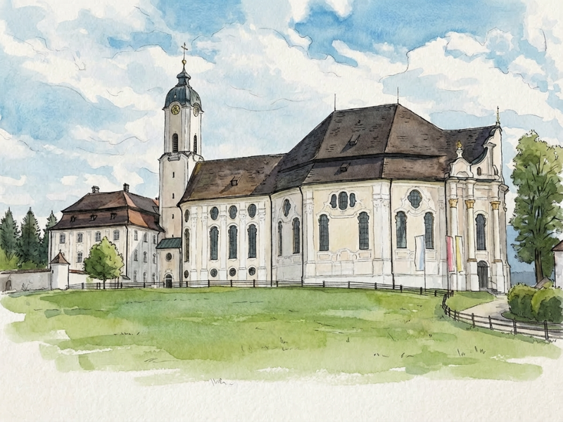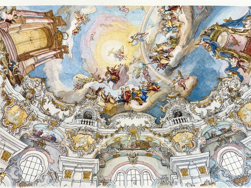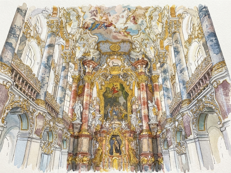 The Wieskirche stands as a breathtaking pinnacle of Bavarian Rococo, where the humble exterior of a pilgrimage church gives way to an explosion of light, color, and spiritual drama. Designed by Dominikus Zimmermann in the mid-18th century, the oval interior is a masterclass in "total art," blending architecture, sculpture, and fresco into a seamless, swirling whole. Gilded stucco flourishes crawl up the pillars like living vines, leading the eye toward Johann Baptist Zimmermann’s magnificent ceiling fresco, which depicts the gates of eternity under a radiant, ethereal sky. Every corner of the space is meticulously engineered to transform the Alpine light into a divine glow, creating an atmosphere that feels less like a static building and more like a captured moment of celestial celebration.